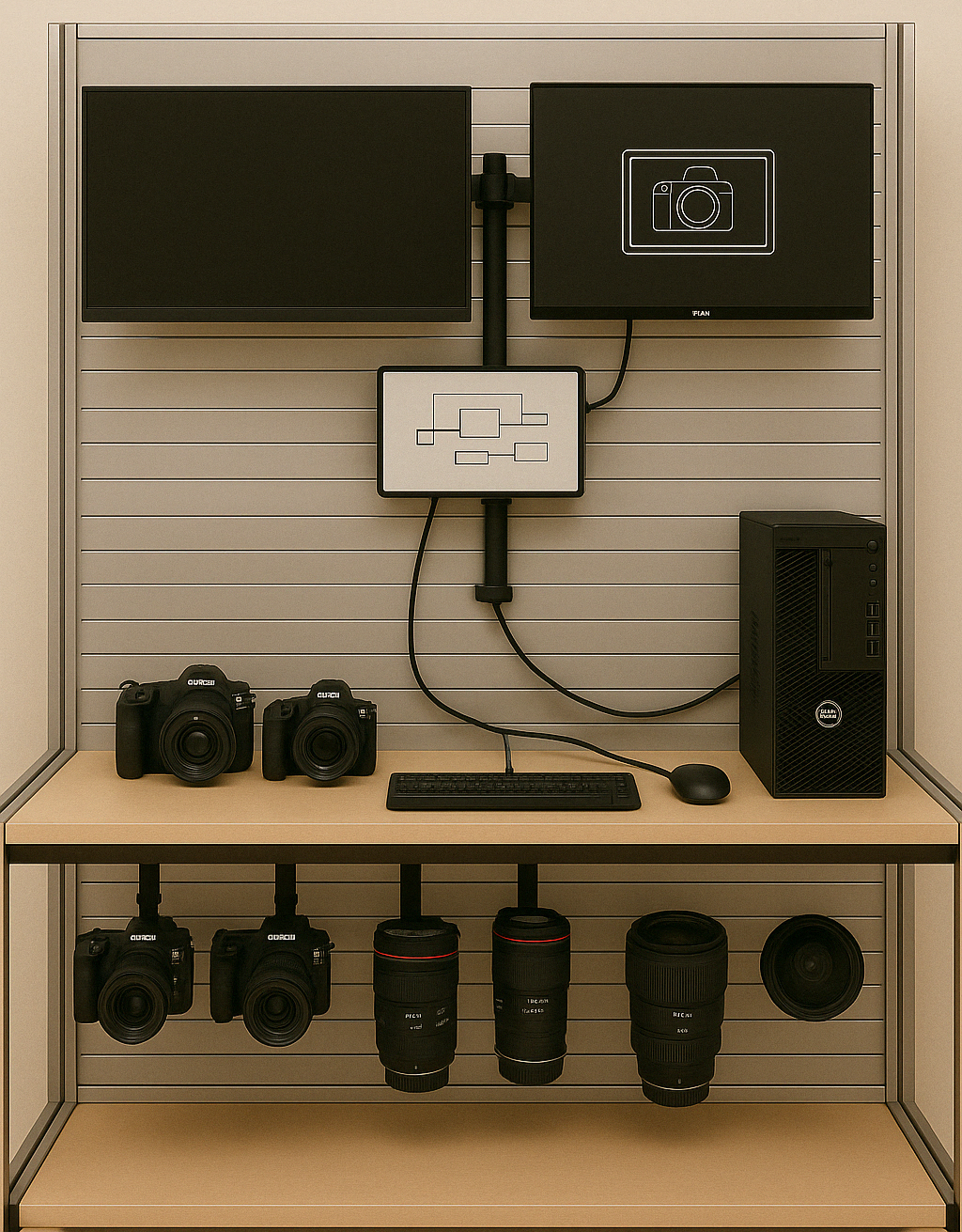 The Photo Studio Training Stand is designed to provide students with practical skills in photography, studio lighting, and image processing. The system covers the entire photography workflow — from image capture to review and analysis — using professional computer equipment.